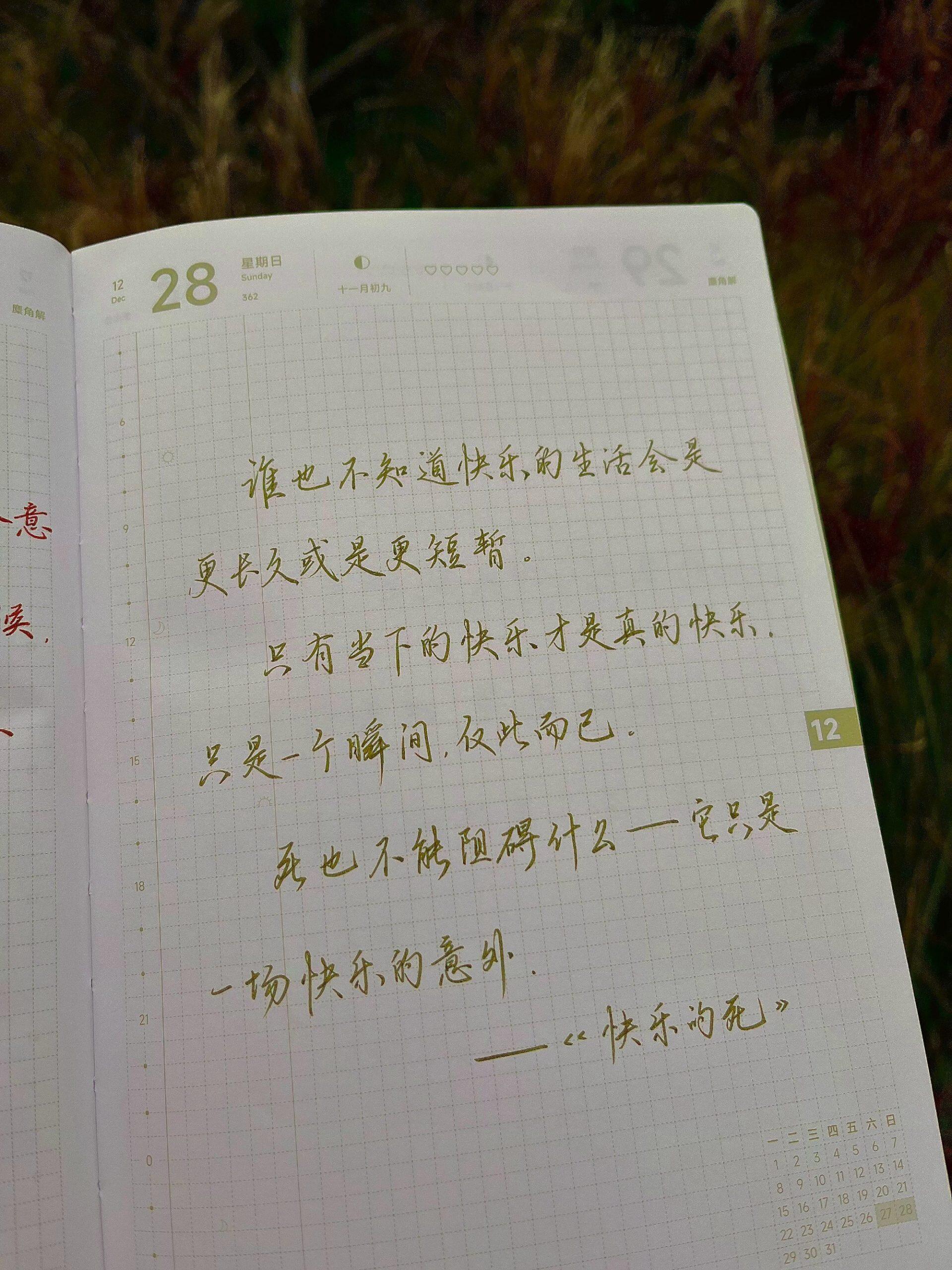 快乐是即开即用的体验装12 月 28, 2025 | 自在心语谁也不知道快乐的生活会是更长久或是更短暂。只有当下的快乐才是真的快乐。只是一个瞬间,仅此而已。死也不能阻碍什么—它只是一场快乐的意外。——《快乐的死》自在手帐每日心语2025年12月28日